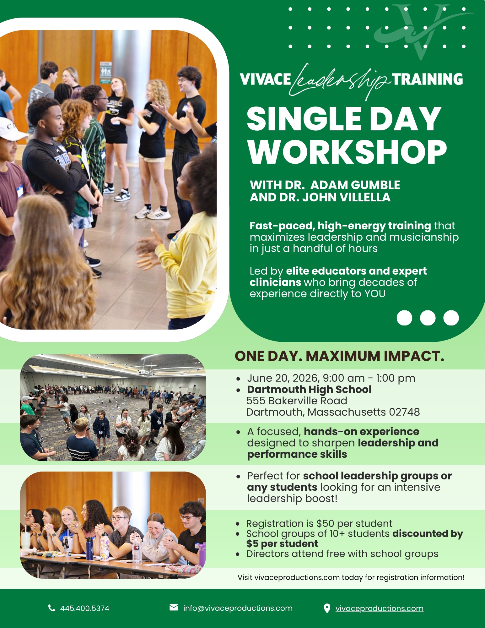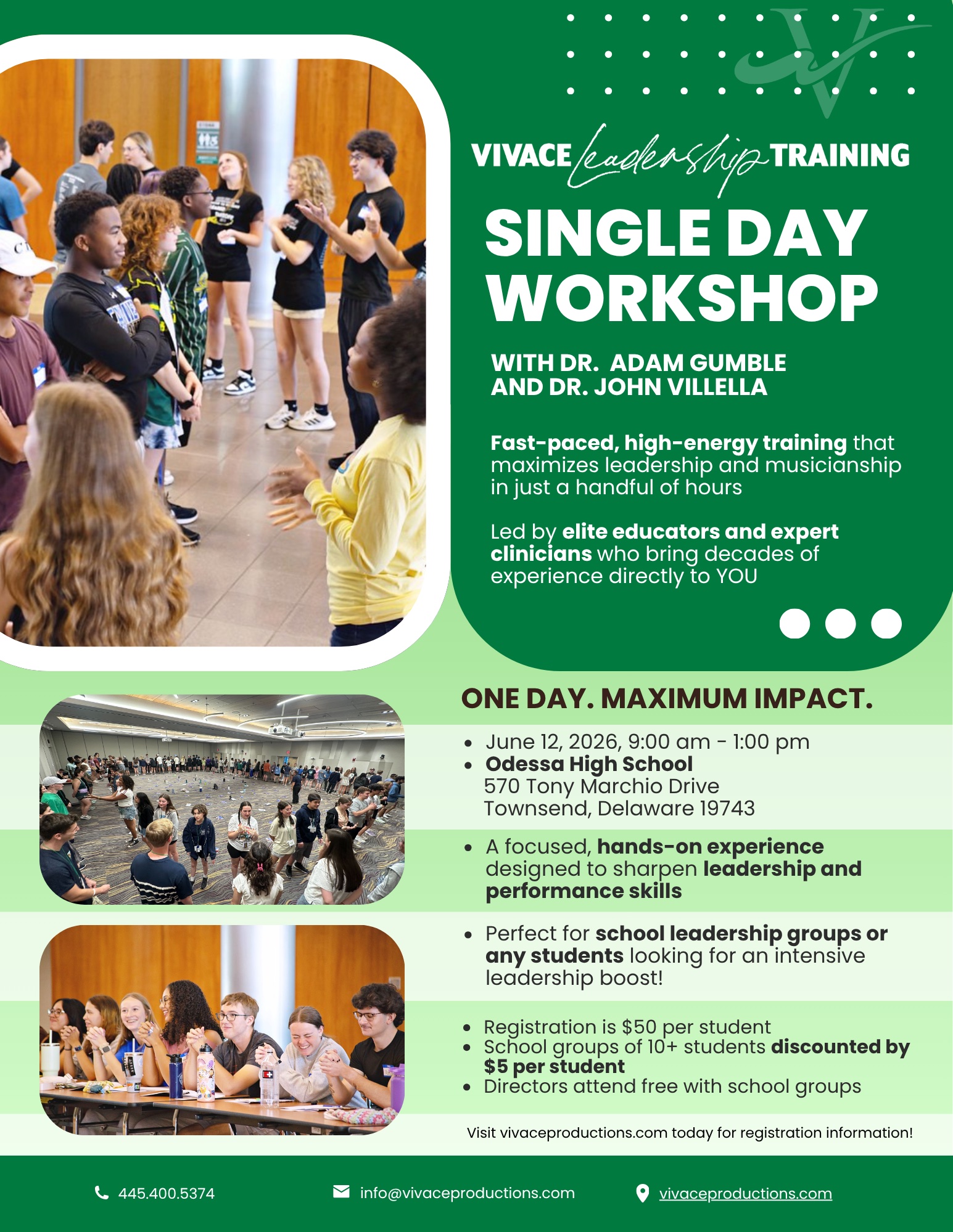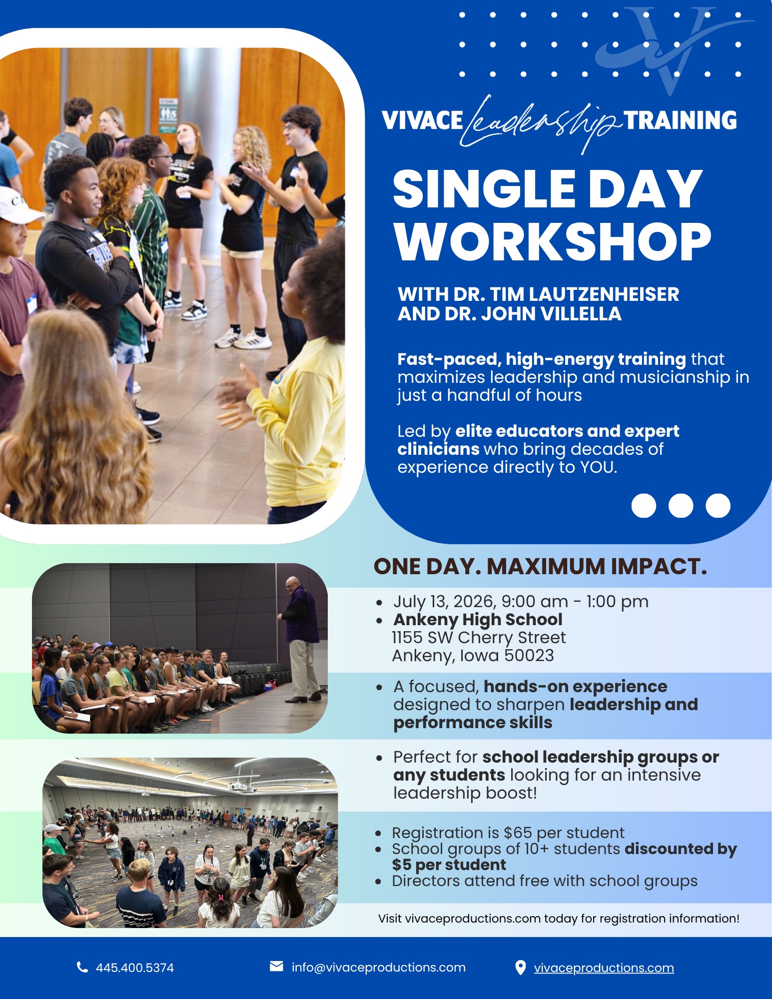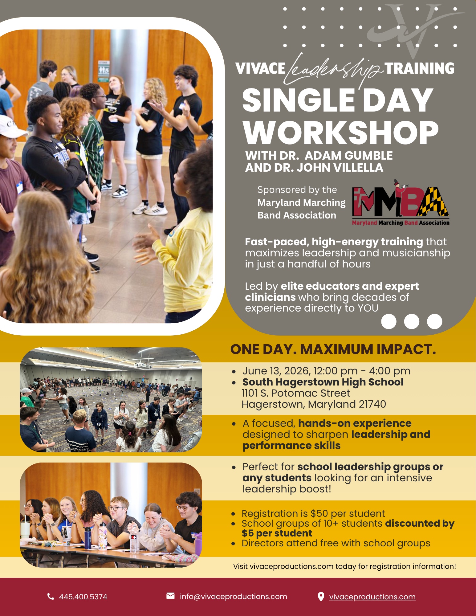 Looking for a leadership experience designed specifically for your band program? The Custom Vivace Leadership Training (VLT) Clinic delivers personalized, high-impact leadership development based on your unique challenges and goals.